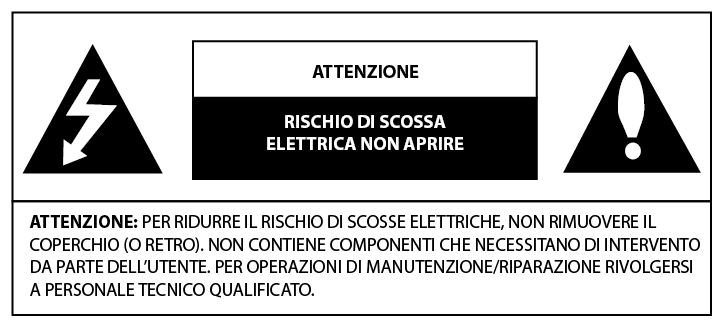 Per ridurre il rischio di scosse elettriche, non rimuovere la copertura o la parte posteriore del prodotto. All'interno non sono presenti parti riparabili dall'utente. Per l'assistenza rivolgersi solo a personale tecnico qualificato.