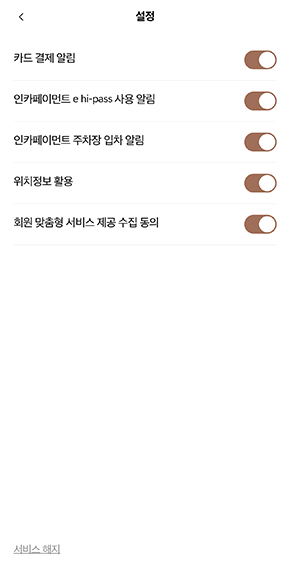 MY GENESIS 앱에서 월렛 ▶ 결제카드 ▶ 설정하기 ▶ 인카페이먼트 ▶ 더보기 ▶ 설정 ▶ 서비스 해지를 눌러 서비스를 해지하세요.