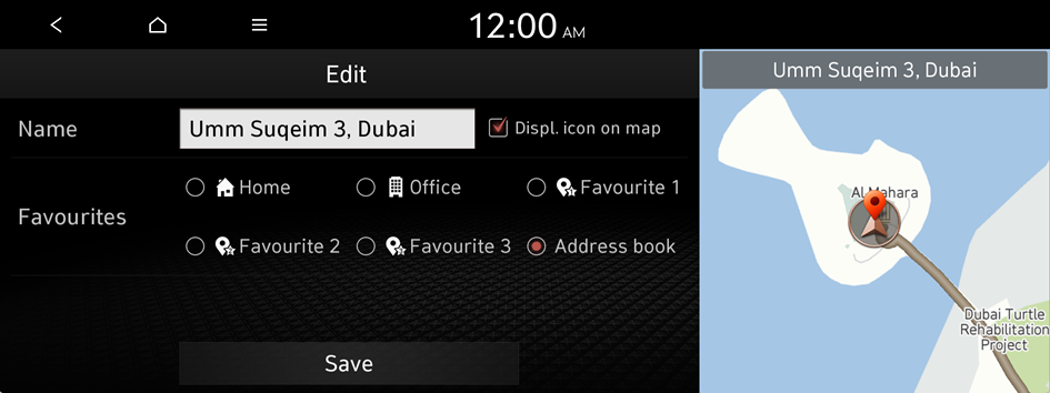 The selected place is saved as a favourite and displayed as a shortcut button at the bottom of the Navigation screen.