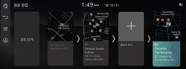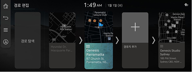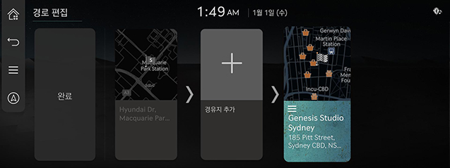 목적지를 설정한 후 최대 2개의 경유지를 추가할 수 있습니다. 경유지 2개가 이미 추가되어 있는 경우 기존 경유지를 삭제한 후 원하는 경유지를 추가하세요.
