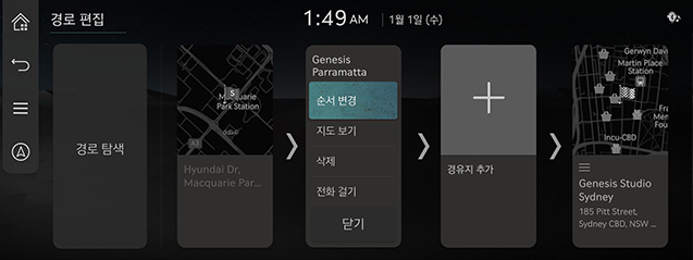 ] > [경로] > [경로 편집]을 누르세요. - 경유지 및 목적지를 누른 다음 [순서 변경]을 누르세요.