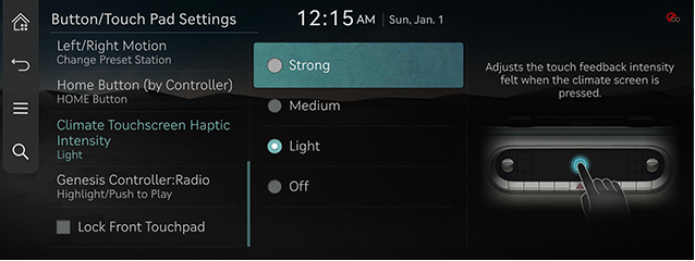 - On the button/touch pad settings screen, Press [Climate Touchscreen Haptic Intensity].