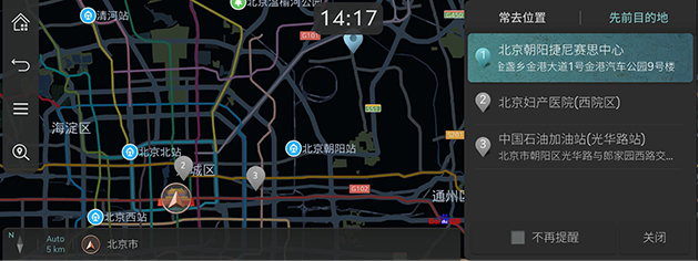 在没有目的地的情况下启动导航,您的常去地点和最近搜索的目的地地点会自动显示在弹出窗口上 10 秒。