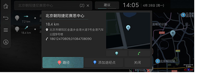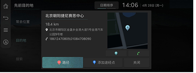 ]:打电话。如果未保存电话号码或未连接蓝牙,则电话不可用。 - 目的地信息:按下弹出窗口中的地图部分,显示目的地的详细信息。