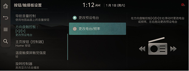 滑动方向盘上的触控板(左/右)可更改电台或频率,或通过拖动来改变预设电台。
