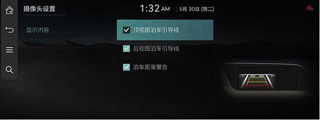 - [后视图泊车引导线]: 在摄像头后视图画面显示泊车引导线。
