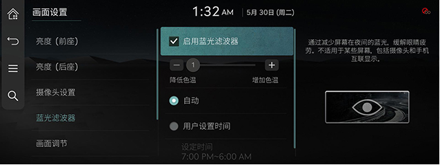 - [启用蓝光滤波器]:减少天黑后屏幕的蓝光,以此减轻眼疲劳。该功能不适用于摄像头和电话投影屏幕。