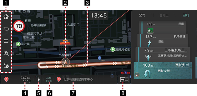 현재 차량 위치에서 설정된 목적지까지의 경로를 표시합니다.