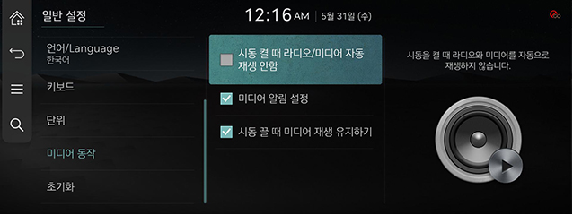 - [시동 켤 때 라디오/미디어 자동 재생 안함]: 시동을 켤 때 라디오/미디어가 자동으로 재생되지 않습니다.