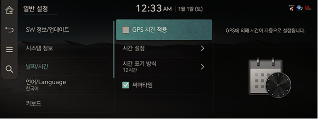 - [GPS 시간 적용]: 시간은 GPS에 의해 자동으로 설정됩니다.