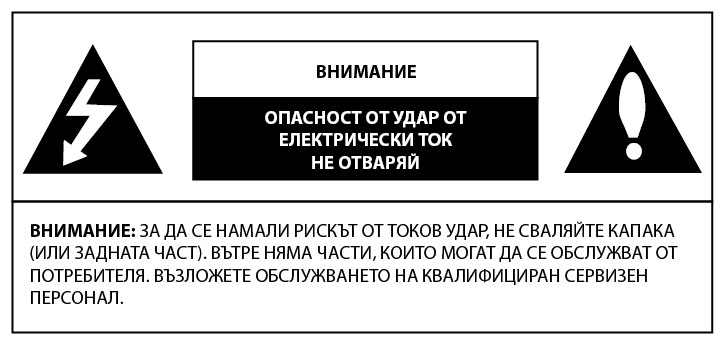 За да се намали рискът от токов удар, не сваляйте капака или задната част на този продукт. Вътре няма части, които да се обслужват от потребителя. Възложете обслужването на квалифициран сервизен персонал.