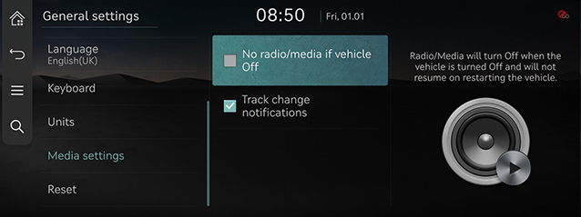 - [No radio/media if vehicle Off]: Raadio/meedia lülitub välja, kui sõiduk välja lülitub ja kui sõiduki taaskäivitamist ei jätkata.