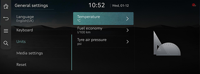 Saate seadistada süsteemis kasutatava temperatuuriühiku, läbisõidu ja rehvirõhu ühiku tüübi.