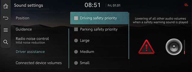 - [Driving safety priority]: Vähendab kõigi muude helide tugevust, kui liiklusohutussüsteem annab hoiatuse.
