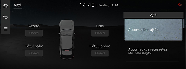 - [Automatikus ajtók]: Beállítja az ajtók automatikus bezárásának módját, és lehetőséget biztosít hangriasztásra.