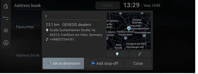 ]: Efectuați un apel telefonic. Dacă nu este salvat niciun număr de telefon sau dacă Bluetooth nu este conectat, apelul nu este disponibil. - Informații detaliate despre loc: Apăsați secțiunea de hartă din fereastra apărută pentru a afișa informațiile detaliate despre destinație.