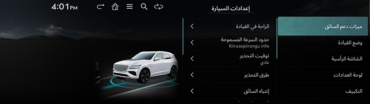 اضغط على ميزات دعم السائق على شاشة إعدادات السيارة.