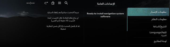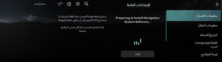 عند التوقف عن القيادة وإيقاف تشغيل الإشعال، تبدأ المرحلة الأخيرة من التحديث. سيُعاد تشغيل نظام الملاحة وأثناء تثبيت أحدث برنامج له، سيتم تقييد جميع الوظائف بما في ذلك الصوت.