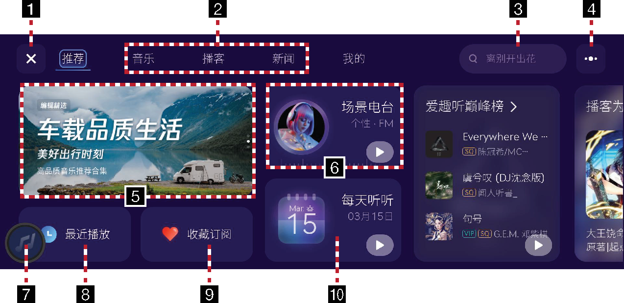 每天听听:专属驾驶听单,为用户提供集气象信息、新闻资讯、音乐、节目等多种 内容的混合型听单。