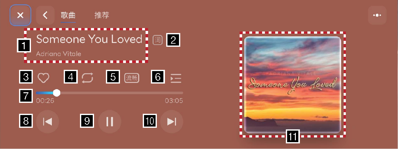 点击任意听单进入播放页,可以进行播放模式切换、上下曲调节,暂停播放控制及收藏 功能。