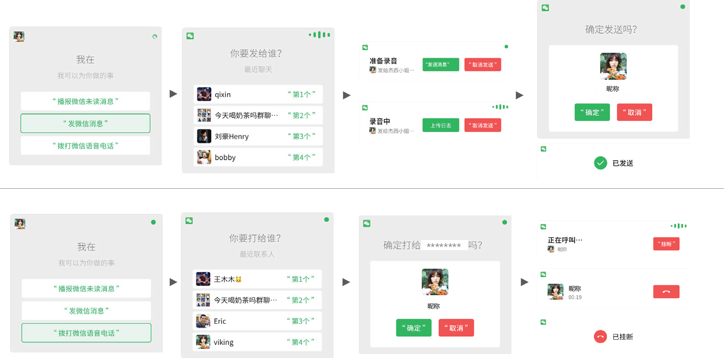 通过方向盘按钮、屏幕触控或语音指令发起:发微信消息/发起微信语音通话,根据引导 说出联系人名称,也可直接说出联系人名称,进行录音或语音通话。
